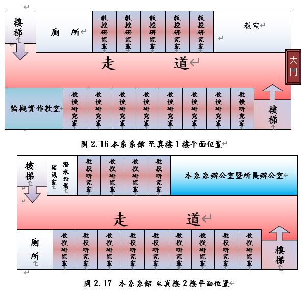 1. 本系擁有單獨一棟系館—至真樓,包括系所辦公室、教授休息室、各種專業教室、教師研究室與圖書室等(如圖2.16、2.17、 2.18、2.19)。本系系所辦公室位於系館(至真樓2樓),辦公室與主任辦公室相通聯(位於系辦公室前端),旨在一般行政處理用途及共同教學設備、文具放置及本系創系歷史文件、檔案並設有各級老師信箱、各類型期刊、雜誌及參考文獻,均由本系助教負責管理,系辦公室配置1部行政事務電腦、印表機及公用電腦1部,協助行政事務及文書作業。另主任辦公室內可分為接待區及辦公區,處理系務、訪客會談與學生交誼之用,有時系務會議會在主任辦公室舉行。