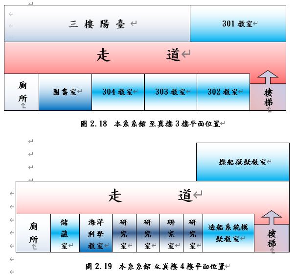 4. 圖書室:位於本系系館至真樓3樓(如圖2.18),收藏各類期刊書籍及雜誌、本所歷屆碩士畢業生之論文、歷屆研討會論文集、各種海洋科技及法律叢書,並有本系創系相關檔案資料,是一個小而美的小型圖書館,提供本系學生查閱資料或撰寫論文之參考資源。